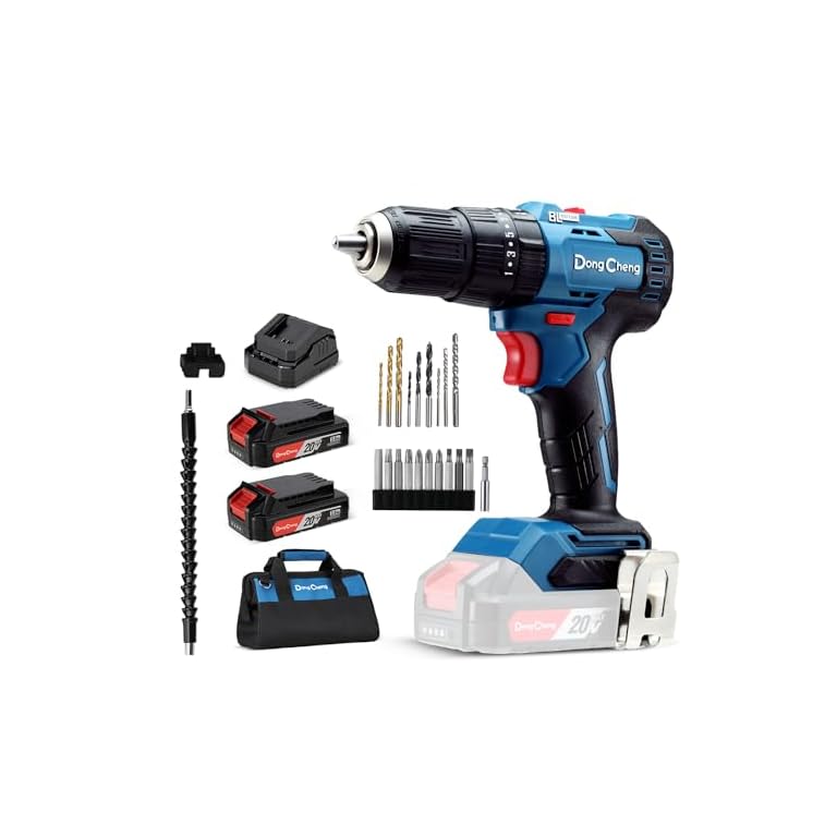 Dong Cheng 20V Brushless Heavy-duty Impact Drill, 443 in-lbs, 27000 IPM, 1/2″ Keyless Metal Chuck, 20+1+1 Clutch, Cordless Hammer Drill with 2 Battery Kit for Drilling Brick Wall, Metal, Wood
