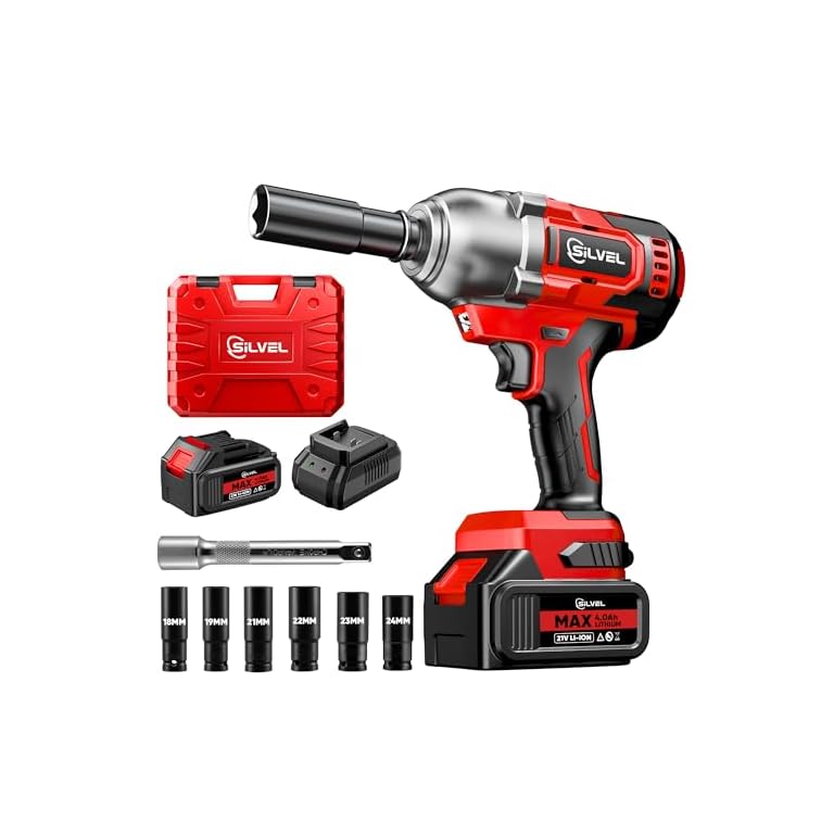 SILVEL Cordless Impact Wrench, MAX 500N.M Brushless Impact Gun 1/2 inch, 4.0Ah Battery, 6 Sockets, 3200RPM Impact Driver wih Fast Charger