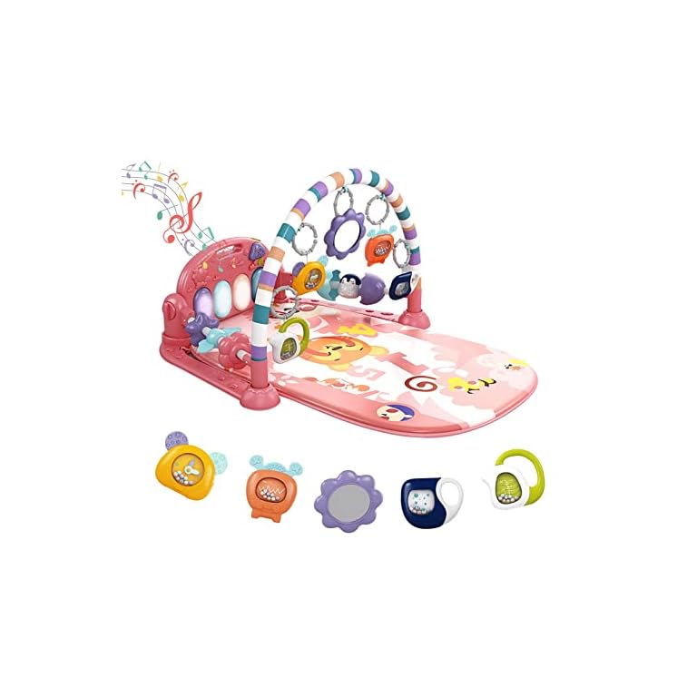 dearlomum Baby Play Mat Baby Gym,Funny Play Piano Tummy Time Baby Activity Mat with 5 Infant Sensory Baby Toys, Music and Lights Boy & Girl Gifts for Newborn Baby 0 to 3 6 9 12 Months (Pink)