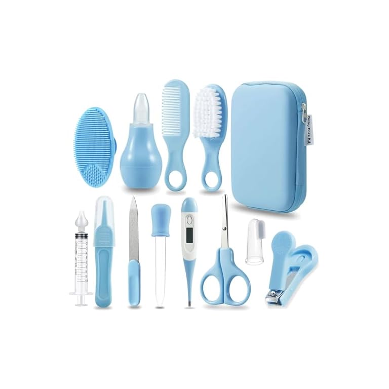 PandaEar Baby Healthcare & Grooming Kit – Baby Safety Set Comb, Brush, Finger Toothbrush, Nail Clippers, Scissors, Nasal Aspirator – Nursery Care Kit (Blue)