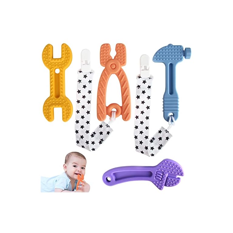 Fu Store 4 Pack Soft Silicone Teething Toys for 0-12 Months 6-24 Months Toddlers Infant Hammer Spanner Wrench Pliers Tools Shape Baby Teethers Relief Soothe Babies Gums Set