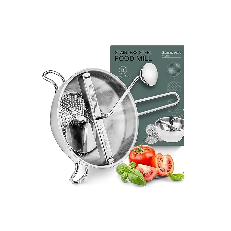 Ergonomic Food Mill Stainless Steel With 3 Grinding Discs – Rotary Food Mill for Tomato Sauce, Applesauce, Puree, Mashed Potatoes, Jams, Baby Food
