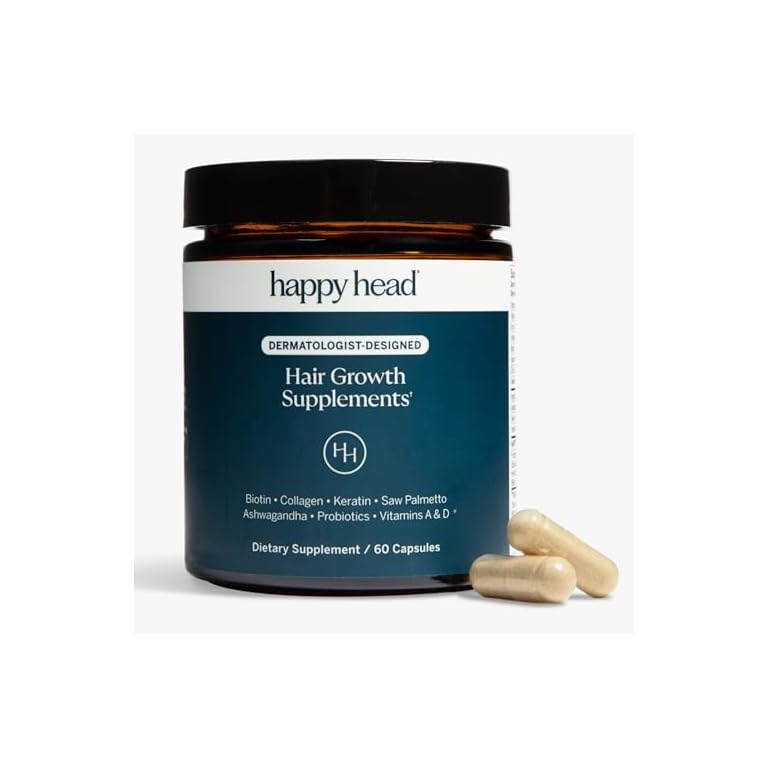 Happy Head Hair Growth Supplement for Men and Women – Thicker, Fuller Hair with Saw Palmetto, Ashwagandha, Biotin, Collagen, Keratin, Probiotics & Vitamins A & D – One Month Supply – 60/ct