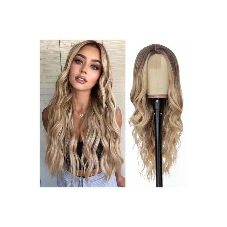 Long Ombre Blonde Wigs for Women 26 inch Long Wavy Middle Part Wig Ombre Blonde Wigs Upgraded Protein Fiber Hair Replacement Wig Cosplay Costume Halloween Wig(26” Brown Ombre Blonde)