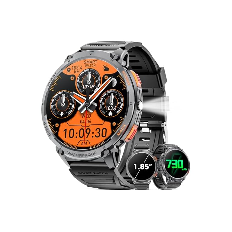 Military Smart Watch for Men 1.85″ HD Touch Screen 730mAh Battery Smart Watches with LED Flashlight for Android iOS (Bluetooth Call Answer/Dial Calls) Fitness Tracker with Heart Rate Blood