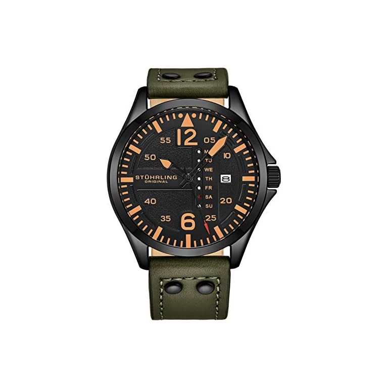 Stuhrling Original Mens Leather Watch -Aviation Watch, Quick-Set Day-Date Leather Band with Steel Rivets,
