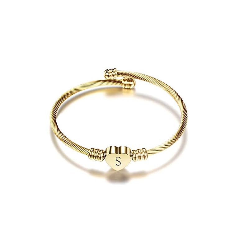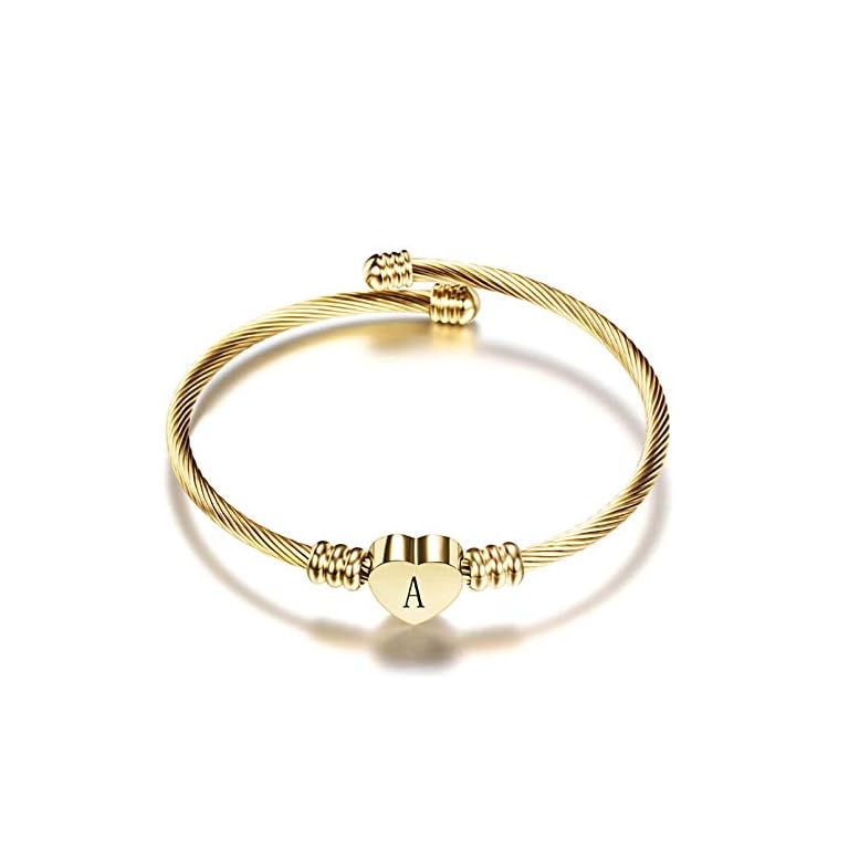 Women Gold Plated Heart Initial A-Z Letter Cuff Bracelets Expandable Stainless Steel Birthday Jewelry