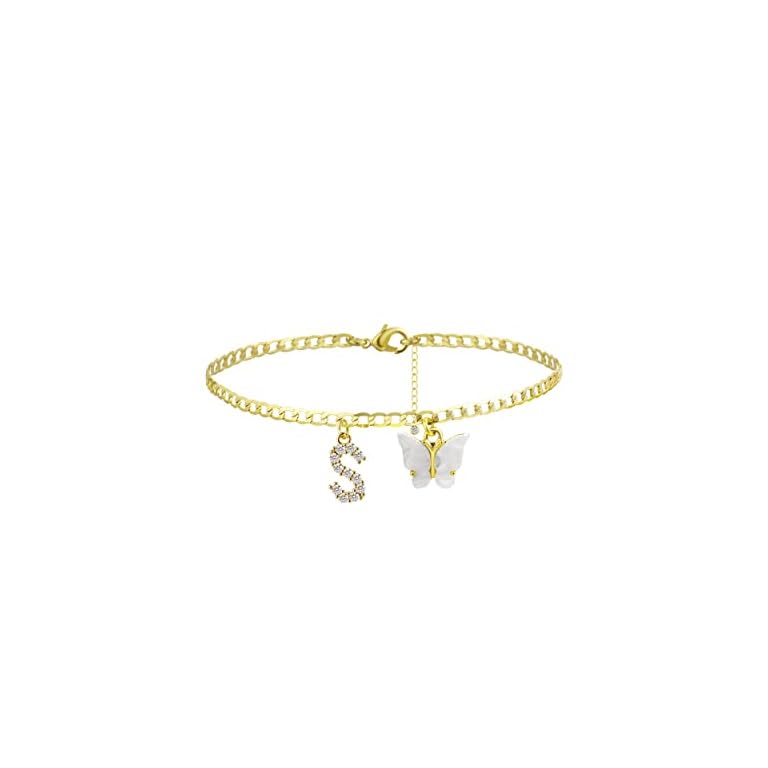 VIROMY 14K Gold Plated Dainty Butterfly Initial Ankle Bracelets Handmade Cuban Chain White Butterfly A-Z Alphabet Letter Initial Anklets Personalized Summer Beach Jewelry Gifts for Women