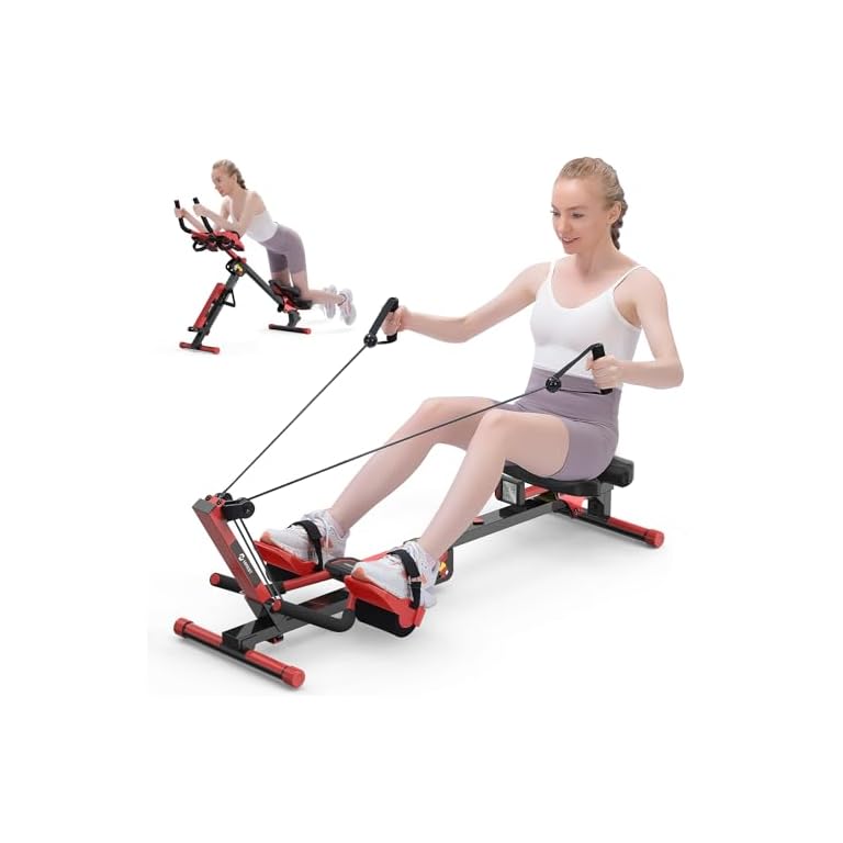 Rowing Machine, 4 in 1 Rowing and Ab Machine with 2 Levels of Workout Resistance, Quiet & Foldable Rower Machine with 3 Adjustable Handle Heights & LCD Monitor, Row Machine for Home Exercise