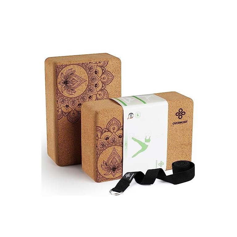 Overmont Cork Yoga Blocks 2 pack with 8ft Strap Set Natural Cork Yoga Bricks- High Density & Eco Friendly Yoga Accessories for Women – Ideal for Yoga Pilates General Fitness and Stretching 9x6x3”