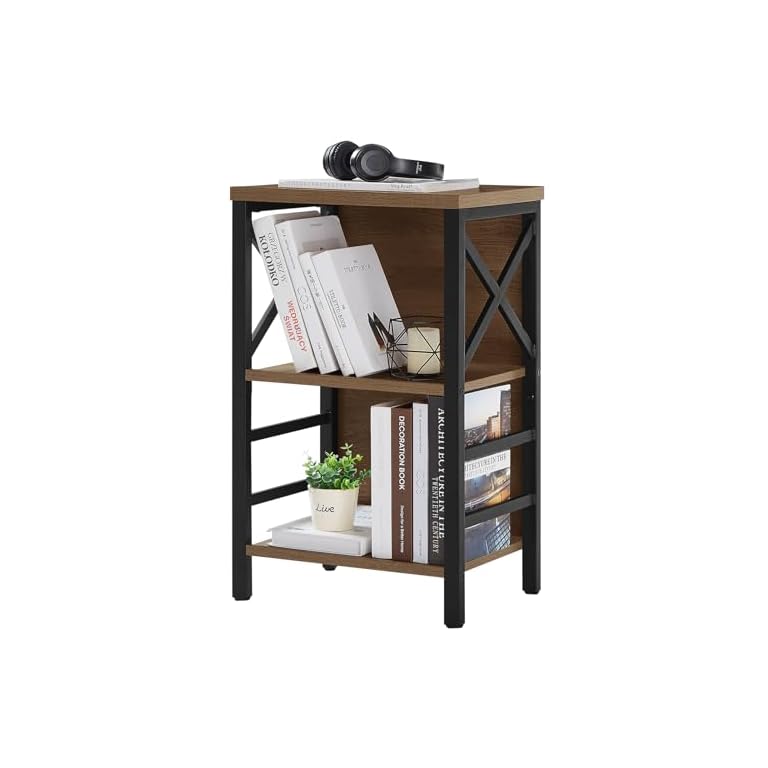 Small Bookcase,3 Tier Industrial Bookshelf with Metal Frame and Backboard,Low Rustic Brown Book Shelf,Book case for Small Spaces,Living Room,Bedroom and Home Office