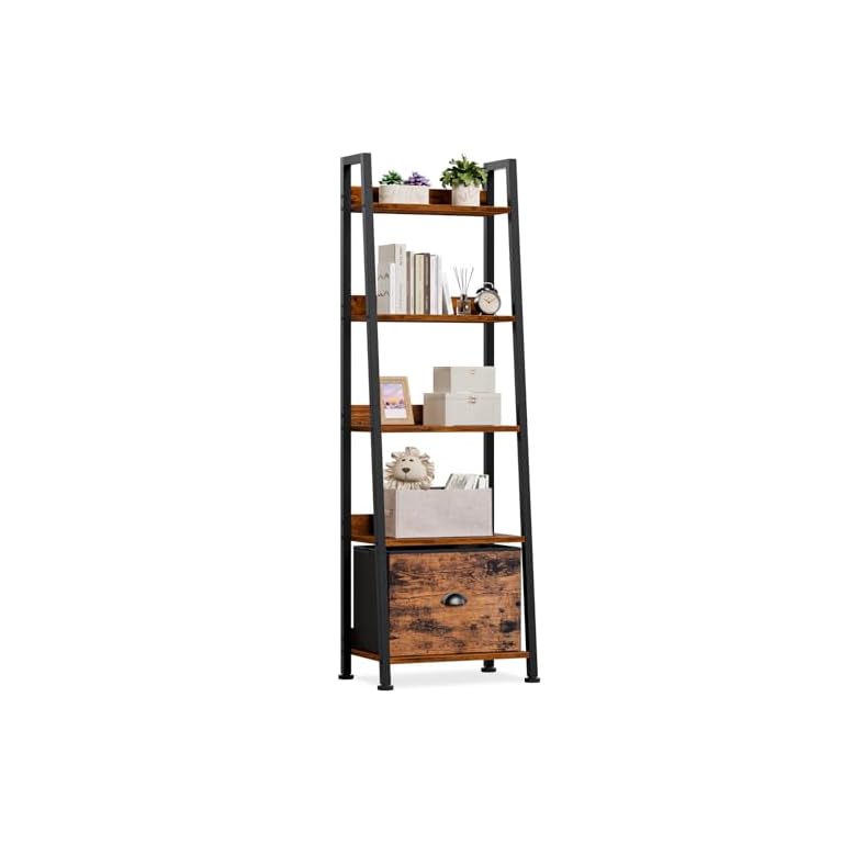 Furologee 5-Tier Ladder Shelf with 2 Drawers,Narrow Bookshelf Storage Shelves,Industrial Bookcase Freestanding Rack Units for Bedroom,Living Room,Bathroom,Home Office,Balcony,Wood Metal,Rustic Brown