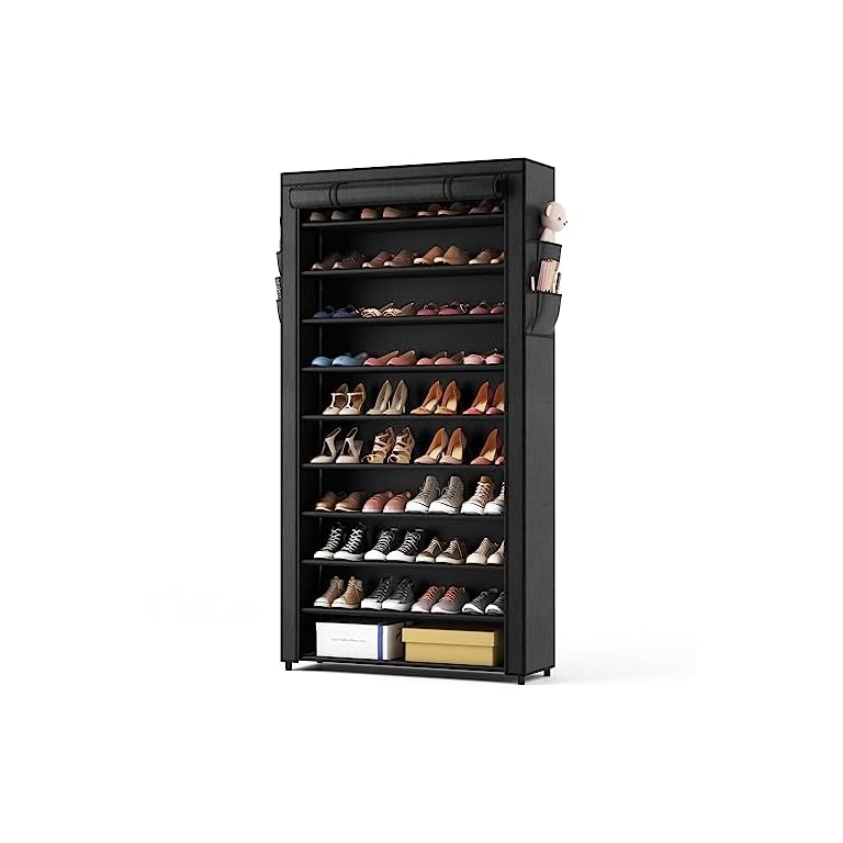 ROJASOP 10 Tier Shoe Rack with Covers,Large Capacity Stackable Tall Shoe Shelf Storage to 50-55 Pairs Shoes and Boots Sturdy Metal Free Standing Shoe Rack Organizer for Closet Entryway Garage