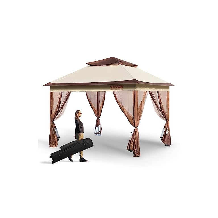 VEVOR Pop up Gazebo for 8-10 Person, with Mosquito Netting, Metal Frame, and PU Coated 250D Oxford Cloth, Outdoor Canopy Shelter for Patio, Backyard, Lawn, Garden, Deck, 11 x 11 FT, Brown