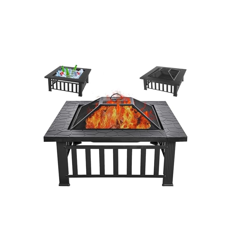 Multifunctional Fire Pit Table 32 inch Square Metal Firepit Stove Backyard Patio Garden Fireplace for Camping, Outdoor Heating, Bonfire and Picnic