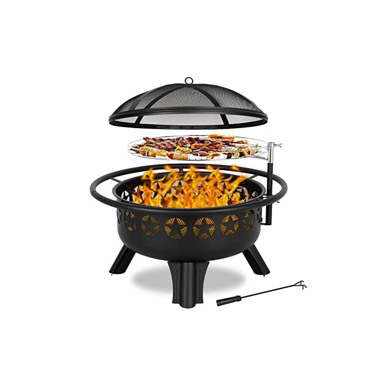 Hykolity 2 in 1 Fire Pit with Grill, Large 31″ Wood Burning Fire Pit with Swivel Cooking Grate Outdoor Firepit for Backyard Bonfire Patio Outside Picnic BBQ, with Spark Cover, Fire Poker