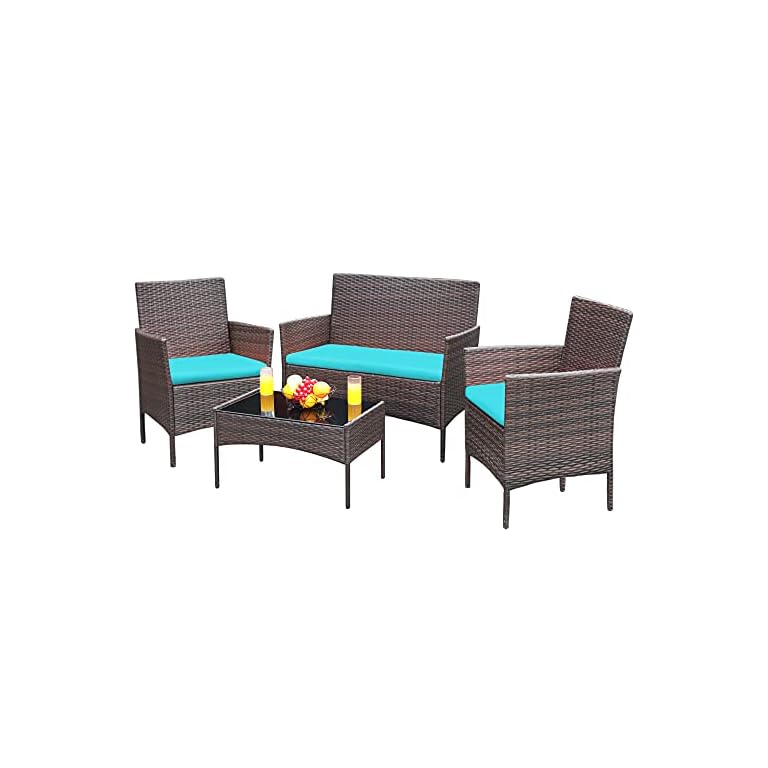 Greesum Patio Furniture 4 Pieces Conversation Sets Outdoor Wicker Rattan Chairs Garden Backyard Balcony Porch Poolside loveseat with Soft Cushion and Glass Table, Brown and Blue