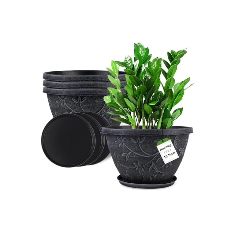4 Pack 12 Inch Large Plant Pots, Plastic Flower Pot for Indoor & Outdoor with Drainage Holes & Saucer, Plaid Pattern Planters Garden Pots for Herbs Bronze