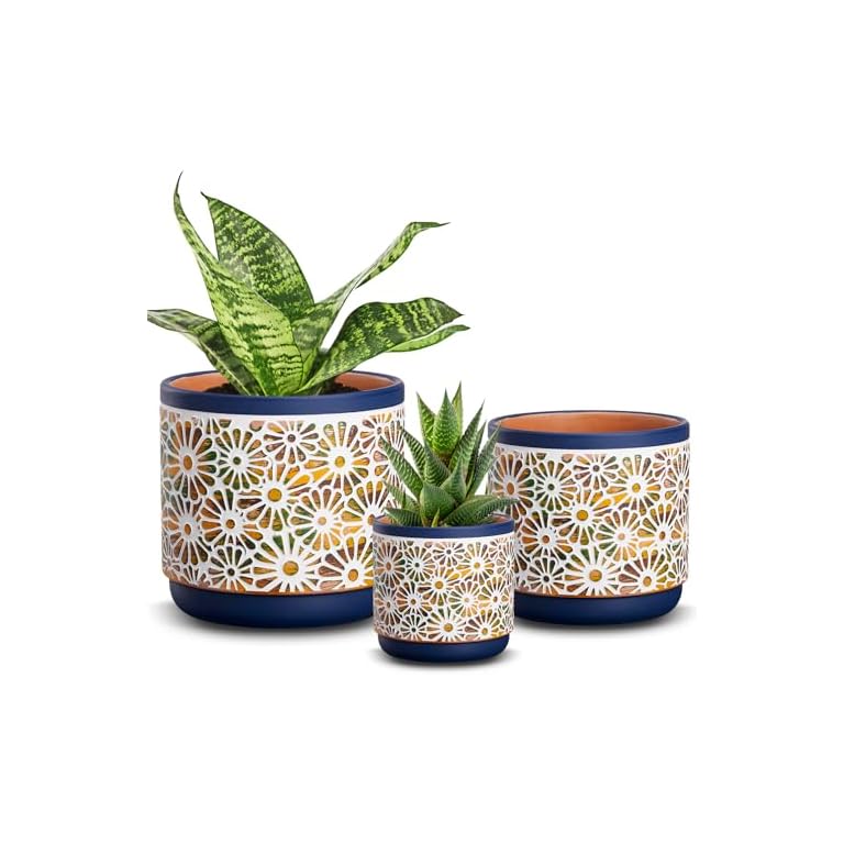6 Pack 8 inch Plant Pots, Retro Pattern Planters with Drainage Holes and Saucer, Sturdy Plastic Garden Flower Pots for Indoor & Outdoor Plants