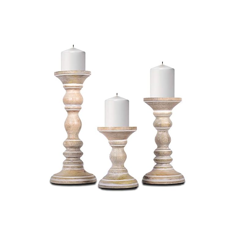 Mela Artisans Whitewash Wood Candle Holders for Pillar Candles Set of 3 | Willow Decor Style for Mantles | White Mango Wood Farmhouse Candle Holders | Rustic Wooden Candleholder | Sized 6″, 9″ and 12″