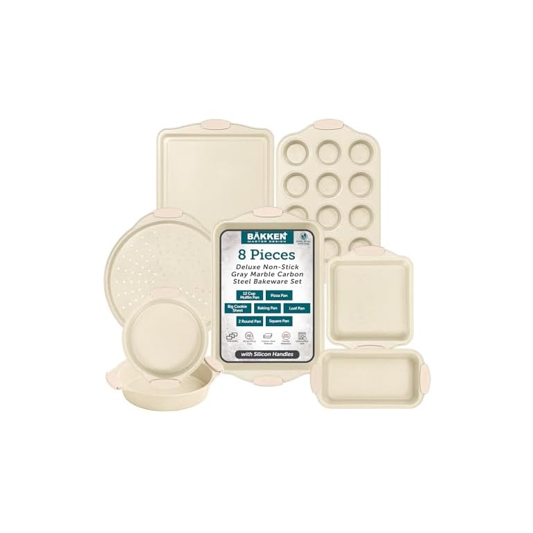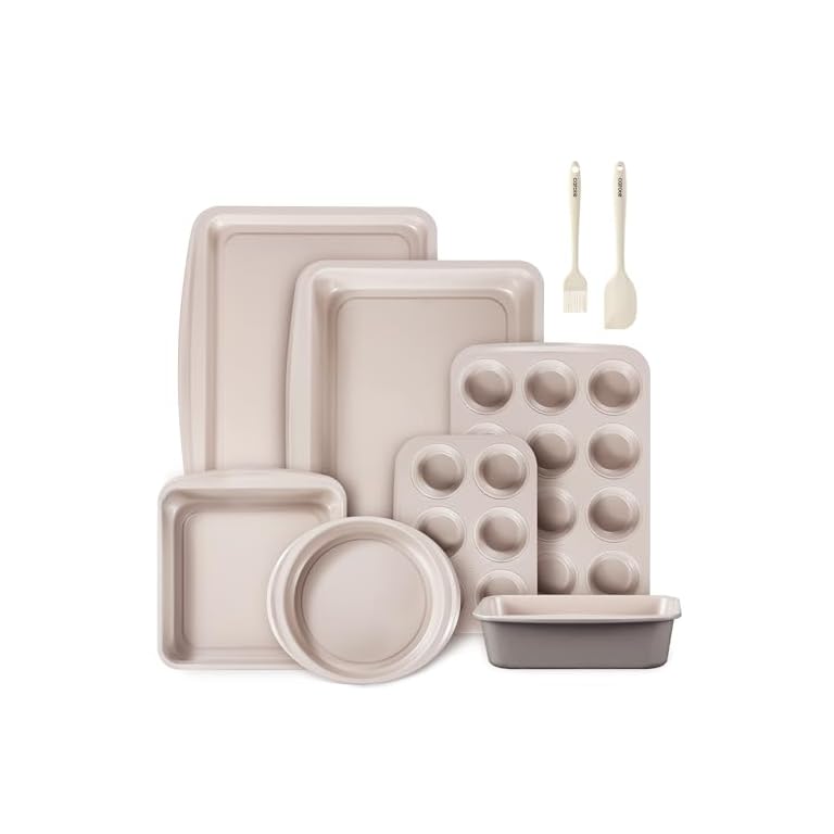 CAROTE 9-Piece Nonstick Stackable Baking Pans Set – Bakeware Sets Including Cookie Sheets, Muffin Pan, Bread Pan, Cake Pan, Loaf Pan, Roasting Pan, Gray & Khaki