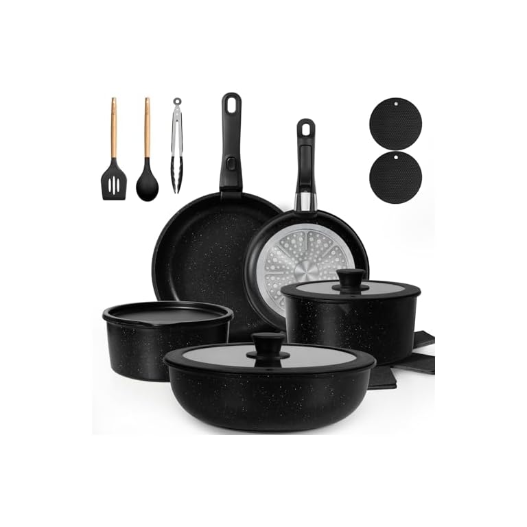 Kitchen Academy Induction Cookware Set-17 Piece Non-stick Cooking Pan Set, Black Granite Pots and Pans Set