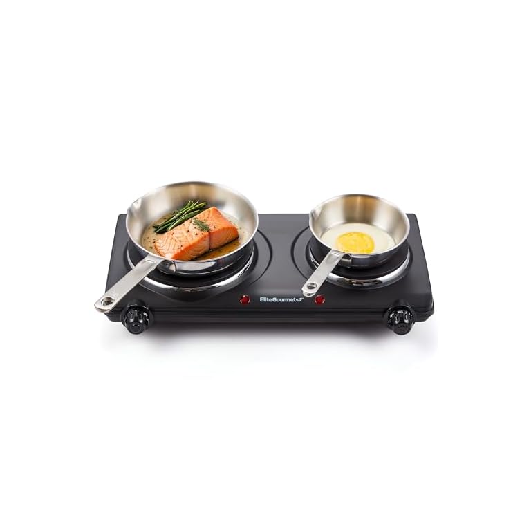 Elite Gourmet EDB-302BF Countertop Double Cast Iron Burner, 1500 Watts Electric Hot Plate, Temperature Controls, Power Indicator Lights, Easy to Clean, Black