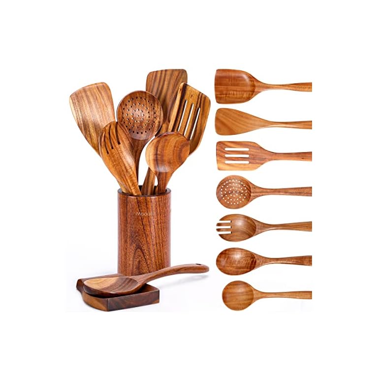 9 Piece Natural Teak Wooden Kitchen Utensil Set with Spoon Rest – Comfort Grip Cooking Spoons and Utensils Holder
