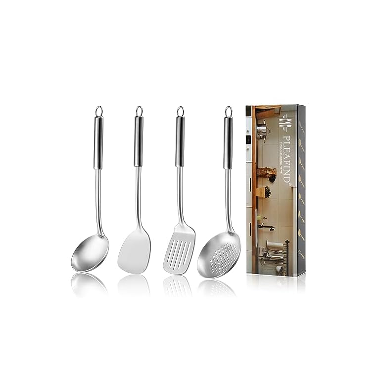 Pleafind 4-Pcs Cooking Utensils Set, Stainless Steel Kitchen Utensils, Wok Utensils Set Include Wok Ladle, Slotted Spoon, Wok Spatula and Slotted Spatula, Dishwasher Safe