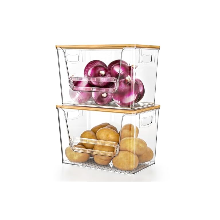 Delamu 2 Set Pantry organizers and Storage, kitchen organizers and storage with Bamboo Top, Stackable Kitchen Pantry bin for Onion,Potato,Fruits,Produce,Vegetable