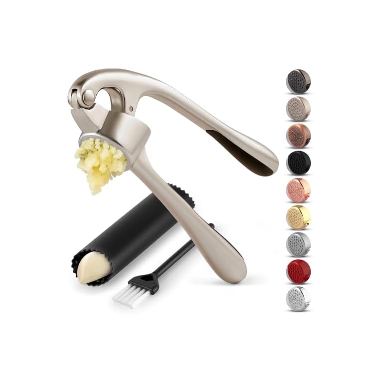 Zulay Kitchen Premium Garlic Press Set – Rust Proof & Dishwasher Safe Professional Garlic Mincer Tool – Easy-Squeeze, Easy-Clean with Soft, Ergonomic Handle – Silicone Garlic Peeler & Brush (Silver)