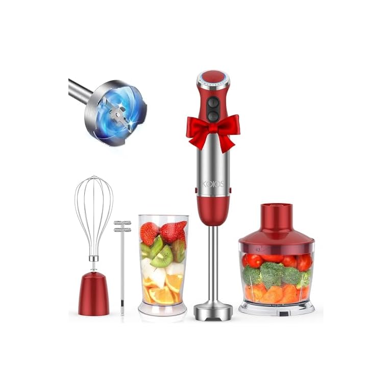 KOIOS 5-in-1 Hand Immersion Blender, 1000W 12 Speed Handheld Blender Stick with Copper Motor Stainless Steel Blade, 600ml Mixing Beaker,500ml Food Processor, Whisk, Milk Frother, Non-BPA, Red