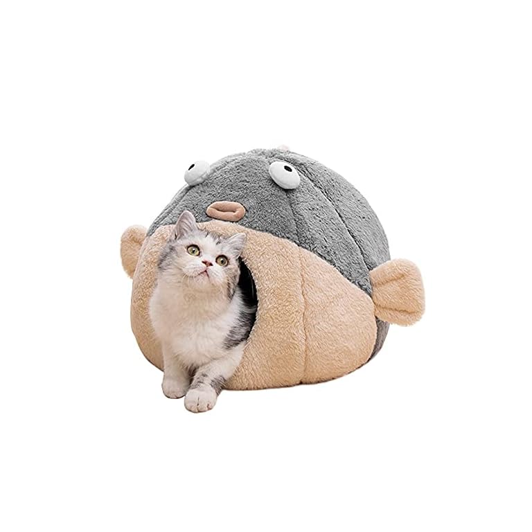 Cat Beds for Indoor Cats – Cat Bed Cave with Removable Washable Cushioned Pillow, Soft Plush Premium Cotton No Deformation Pet Bed, Lively Pufferfish Cat House Design, Grey, Multiple Sizes(L)