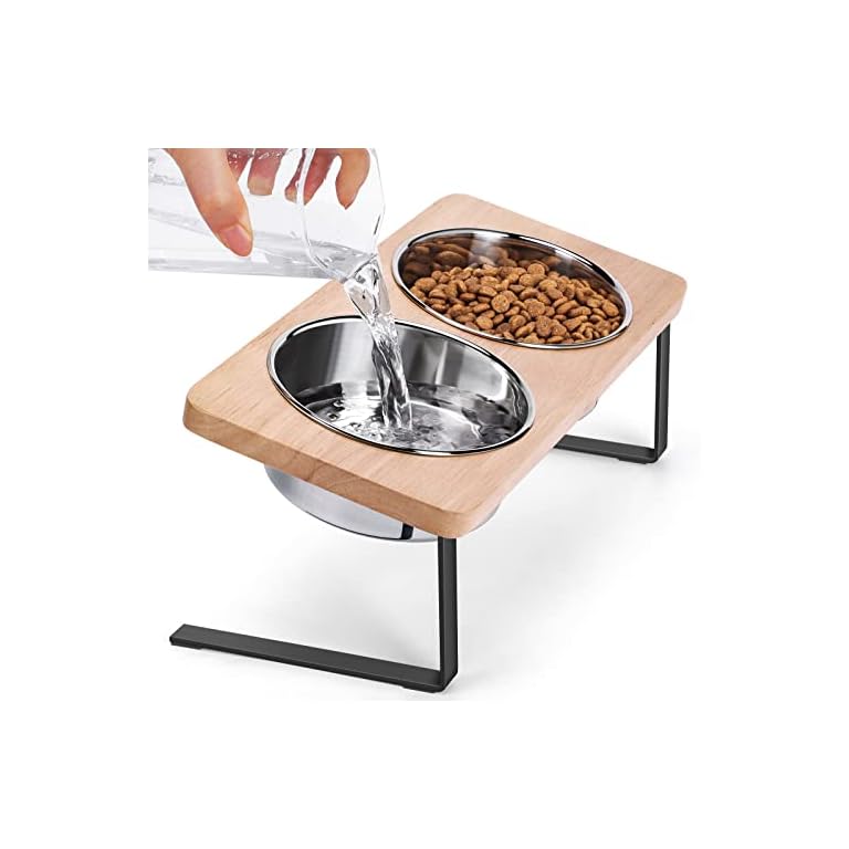 Elevated Cat Bowls, 15° Tilted Raised Cat Food Bowls Wood Pet Bowls with Stand Anti Vomiting 2 Stainless Steel Bowls for Cats and Puppy