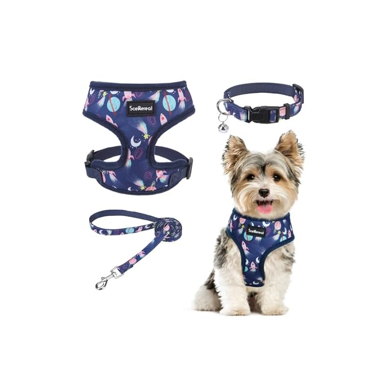 SCENEREAL Small Dog Harness Collar and Leash Set, Adjustable No Pull Pet Harnesses, No Chock Soft Mesh Step in Vest for Doggie Puppy Medium Dogs Cats Girl or Boy,Chihuahua, Yorkie, Outdoor Walking