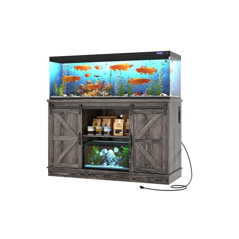 Farmhouse 55-75 Gallon Fish Tank Stand with Power Outlet, Aquarium Stand with Cabinet&Sliding Barn Door, Heavy Duty Reptile Tank Stand for 2 Fish Tank/Turtle Tank/Reptile Terrarium, Grey