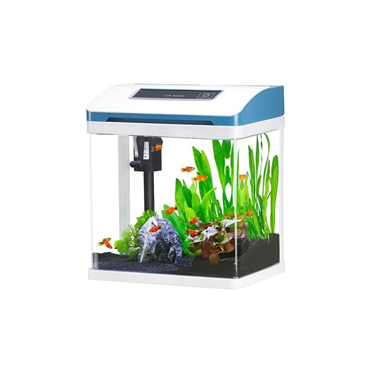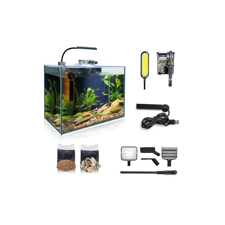 Small Aquarium Starter Kit, 2.6 Gallon Glass Betta Fish Tank with Heater Self Cleaning System Efficiency Filter Bright Light Rocks Gravel Cleaning Tool Set, Leak-Proof Ultra-Clear Rimless Desktop Tank
