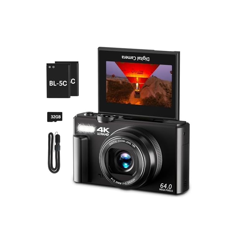 4K Digital Camera, Autofocus 64MP Vlogging Cameras for YouTube with 3.0″ Screen Dual Cameras Flash 18X Digital Zoom Compact Travel Camera with 64GB SD Card, 2 Batteries for Photography Beginner