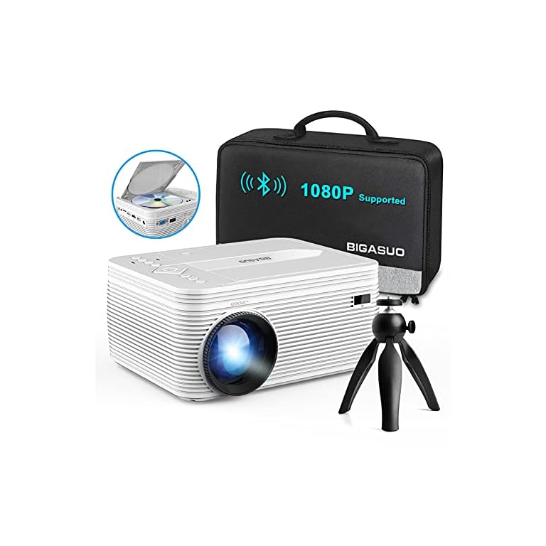 BIGASUO HD 9000L Bluetooth Projector Built in DVD Player, Mini Outdoor Movie Projector 1080P and 250”Supported with Tripod and Carry Bag, Compatible w/ TV Stick, PS5, Laptop